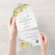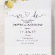Citrus Lemon All in One Wedding Invite. Este elegante y elegante Wedding Shower Invitation presenta una preciosa coloración de agua pintada a mano con Lemon Blossom. Encontrar elementos coincidentes en la colección Floral de cítricos de limón y vegetación.