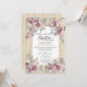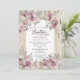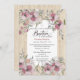 Florales de color de malva y las hojas acentúan un fondo de madera natural. Una cruz minimizada adorna el top de la invitación.