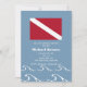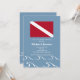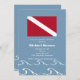 Sumérjase en una divertida celebración honrando a un entusiasta del submarinismo con esta bonita invitación. El fondo azul medio tiene olas de océano blancas y una bandera de submarinismo que indica "buceo en el agua". La tarjeta es fácil de personalizar con su redacción, fuente, color de fuente y elección de seis tipos de papel.