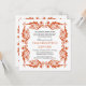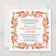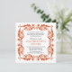 Una manera elegante de invitar a tu familia y amigos a tu próxima reunión, ya sea una cena o un fiesta de cócteles, una fiesta de compromiso o una ocasión especial de vacaciones como tu cena de Acción de Gracias. Un cuadro barroco en el naranja otoñal resalta tu texto personalizado de invitación a fiesta. El marco se repite en la parte posterior, donde puede agregar texto adicional o eliminarlo. Disponible en colores alternativos con productos coincidentes.