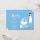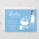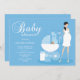 Invitación a una ducha de bebé con una mujer de cabello negro al lado de los regalos.