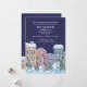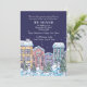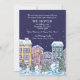 Escena de invierno encantadora con casas cubiertas de nieve en una noche nevada. Adecuado como una invitación en movimiento, Navidades fiesta, Open House y más.