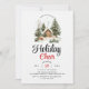 Invitación a la fiesta de Navidades de invierno. Muestra un pintoresco paisaje invernal adornado con árboles cubiertos de nieve, cada uno de ellos bellamente adornado con vibrantes adornos navideños y una casa. La frase "Alegre de vacaciones", que invita a los huéspedes a participar en las fiestas de temporada, se muestra de forma destacada. El fondo está cubierto de copos de nieve grises y mullidos, lo que realza el encantador ambiente invernal.