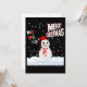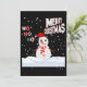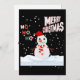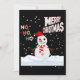 Esta invitación muestra las palabras "Feliz Navidad Ja Ja Ja" en una fuente de letra única con letras multicolores y Navidad El Muñeco de Nieve viste rojo y blanco con nieve cayendo en el fondo en este tema y estilo de Navidad. Impreso en un papel clásico, todo alrededor de 17,5 pt de grosor con un acabado mate sin revestimiento con una textura de cáscara de huevo hecho e impreso en EE. UU. con "Feliz Navidad" impreso en la parte posterior.