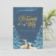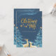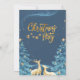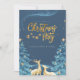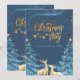 Una encantadora invitación a una fiesta de Navidad con un profundo cielo nocturno azul oscuro lleno de estrellas brillantes y un resplandor mágico y giratorio. El texto dorado dice 'Fiesta de Navidad', acentuado con delicadas estrellas colgantes, mientras dos elegantes renos dorados miran hacia arriba. Los árboles de abeto cubiertos de nieve enmarcan la escena, realzando la atmósfera acogedora y festiva. Este diseño evoca un sentido de asombro, calidez y alegría navideña, perfecto para invitar a los invitados a una celebración de Navidad inolvidable.