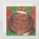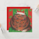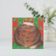 Un feliz gato de los tortoiscones (¡que se parece a un pudín de navidades!) se sienta en un cojín verde contra un fondo rojo y verde con motivos en hojas huecas. Invitación con un diseño de personalizable rojo, verde y blanco para que usted pueda personalizar con su propio texto, imágenes e ideas. Dibujo original de Jess Perry a lápiz de color.