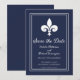 Elegante y simple invitación de boda para guardar la fecha con un fleur de lis sobre un fondo Navy. Este diseño es una opción única para anunciar una boda moderna. Fácil de personalizar con los detalles de su boda. Haga clic en "Personalizar" para encontrar más opciones de personalización.