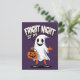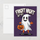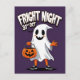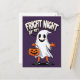 Una tarjeta postal alegre y espeluznante de Halloween que presenta un fantasma de dibujos animados divertido que sostiene un cubo de dulces de calabaza brillante naranja. El diseño utiliza un fondo púrpura profundo con un texto en negrita "NOCHE DE TERROR 31 DE OCT". Esta tarjeta vertical es perfecta para una invitación a una fiesta de Halloween amistosa, un saludo general de temporada o un anuncio para un evento de truco o trato para niños. Su estilo atractivo y no aterrador es ideal para todas las edades.