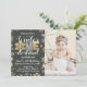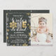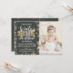 Invitación de invierno con foto con copos de nieve de oro y plata y fondo negro para celebrar el primer cumpleaños tu pequeño copo de nieve. Ideal para niños y chicas.