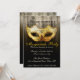 Invitación de Oro de Fiesta de Disfraces de Celebración de Lujo. Una invitación elegante y sofisticada que presenta una máscara de disfraz dorada con florituras negras, un fondo dorado con un patrón damasco sutil que se superpone en negro y tipo de letra elegante que se puede personalizar para los detalles de su fiesta.