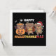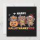 Hallothanksmas feliz: feliz Halloween, Día de Acción de Gracias y Navidad. El oso está disfrazado de murciélago en Halloween. Con una tarta para el Día de Acción de Gracias. decorado con el gorro de Santa en Navidad.