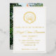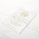 Invitación de bautizo de papel de aluminio con concha de vieira y acuarela de iglesia en la parte posterior.