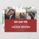Anuncie su reciente compromiso con esta tarjeta de Navidades que incluye tres de sus fotos personalizados. Personalizar la plantilla con tus tres fotos (recortar a un cuadrado antes de cargar para obtener los mejores resultados). La parte delantera de esta tarjeta de vacaciones de invitación de compromiso dice - ¡Ella dijo que sí! Deseamos a nuestra familia y amigos un Navidad bendito y un año nuevo feliz y saludable. Personalizar la parte inferior de la tarjeta con sus nombres. La tarjeta vuelve a un diseño festivo rojo y verde. Póngase en contacto conmigo a través del botón de abajo si necesita ayuda o personalización adicional.