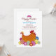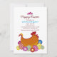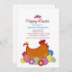 Una invitación festiva al brunch de Pascua y el huevo cazan. La tarjeta ofrece una gallina con los huevos adornados y las flores caprichosas. El jefe tiene tres pequeños corazones y las palabras "Pascua feliz".