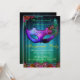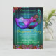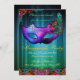 Invitación de Pavo Real para Celebración de Fiesta de Máscaras. Una invitación elegante y sofisticada que presenta una máscara de máscara de tono púrpura con florituras negras y falsos cristales alrededor de los ojos, un fondo ombre azul y verde con un patrón damasco sutil que se superpone en negro y tipo elegante que se puede personalizar para los detalles de su fiesta. Las plumas de pavo real adornan la máscara y los bordes inferiores de la invitación.