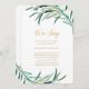 Este sencillo aviso de postergación del boda botánico verde sabio y blanco es una manera sencilla y dulce de hacer saber a los invitados que la ceremonia ha sido pospuesta debido a eventos imprevistos. Este diseño de moda presenta el hermoso guión de caligrafía "lo sentimos" en hojas de color bonito y oro falsas.