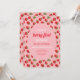 Invitación divertida de cumpleaños "Berry first" con un toque retro para las celebraciones de 1er cumpleaños. Presenta un elegante patrón de fresa, rojo sobre fondo rosado con fuente contrastante y un patrón de fresa también en el reverso.