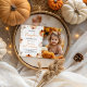 Celebra que tu calabaza se vuelva una con esta adorable invitación de cumpleaños. Con calabazas acuáticas, detalles rústicos de otoño y espacio para la foto de su hijo, este diseño es perfecto para una fiesta de cumpleaños de otoño de temporada. Personalice con el nombre, la foto y los detalles del fiesta de su hijo para crear una invitación única y memorable para amigos y familiares.
