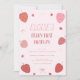 Invitación a Berry First Birthday por Chica Doodles Bow & Strawberry Primer cumpleaños | Colección ICHIGO ¿Es su primer cumpleaños de Berry 🍓 planear una fiesta de primer cumpleaños de un chica? Reúne a su familia y amigos con una invitación para una fiesta de cumpleaños. Edite fácilmente su invitación editable de fresa rosa y roja de primer cumpleaños con todos los detalles de la fiesta de cumpleaños del tema de fresa para el dulce de berry de un año. Esta invitación a la fiesta de cumpleaños de Berry rosa marca el tono para la celebración de su primer cumpleaños con el tema de fresa. La colección ICHIGO presenta un fondo rosa claro con doodles de fresas en rojo y rosa, además de arcos dibujados a mano. Las tipografías pegadizas escritas a mano, serif y sans serif en rojo y rosa con todo el texto editable completan esta invitación chica de fresa de primera fiesta de cumpleaños. ¡Ideal para un chica de verano con el tema del primer cumpleaños!