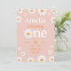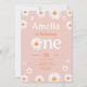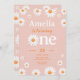 ¡Celebra el primer cumpleaños de tu pequeña con esta adorable invitación temática de margarita! El estilo es un poco ruidoso / hippie y cuenta con un fondo rosa rubor, fuentes retro lúdicas y una salpicadura de flores blancas bonitos.