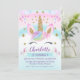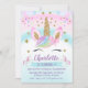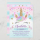 Invitación de cumpleaños de unicornio con un poco de bling. Este diseño tiene una cara de unicornio, dos nubes, un poco de corazón y falsas estrellas de oro, un cartel y dos pequeños unicornios. El fondo está formado por un ligero arco iris azul y rosa. Los colores son esencialmente azules y rosas, con toques de color violeta y verde. Esta chica mágica invitación de cumpleaños de arco iris unicornio está lista para ser personalizada. Para más diseños de invitación de cumpleaños unicornio por favor visite la tienda.