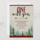 Invitación de primer cumpleaños de Red Plaid Boy Lumberjack Con bosque verde y estilo rústico, esta invitación al leñador es perfecta para el primer cumpleaños de su bebé
