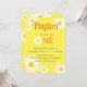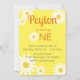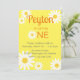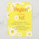 Las margaritas blancas brillantes adornan esta encantadora invitación al primer cumpleaños del bebé. Tarjeta amarilla brillante con tipografía naranja
