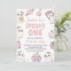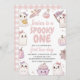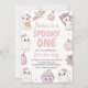 Celebre el primer cumpleaños de su bebé con esta adorable invitación temática con adorables fantasmas pastel, calabazas, murciélagos y telarañas. Perfecto para un fiesta de boo de Halloween, este diseño de personalizable le agrega un toque divertido y caprichoso a la celebración de su hito. Personalice con el nombre de su hijo, los detalles del fiesta y haga que su evento sea inolvidable.
