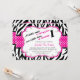 Empiece bien la celebración con esta moderna invitación a rayas de cebra en blanco y negro con una cinta de polka puntiaguda rosa al otro lado del centro. Perfecto para esa pequeña diva que gira Uno! Hay un centro en forma de burbuja blanca con un adorno rosa caliente. La información del fiesta está escrita en la etiqueta blanca. Consulte los muchos otros productos y diseños de esta línea. © babystar