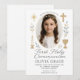 Celebre el sagrado momento de su hija con esta elegante invitación de Primera Comunión. Cuenta con un delicado borde con volantes, ilustraciones religiosas en dorado suave (cruz, vela, cáliz) y un marco de foto ovalado. Perfecta para comuniones tradicionales, rústicas o modernas