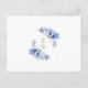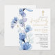 Tarjeta de invitación de primera comunión floral transparente de elegante azul polvoriento que se puede personalizar con su información en tipografía chic con su monograma en el reverso. Diseñado por Thisisnotme©