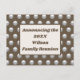 Anuncie su reunión familiar con estas bellas y baratas postales. El patrón en la parte delantera presenta un elegante patrón de puntos de polka plateado contra un fondo marrón oscuro. El centro cuenta con un rectángulo de borde marrón con un centro gris claro que proporciona el fondo para la invitación, el nombre de la familia y el año. En la parte trasera de la postal hay mucho espacio para los detalles del evento.
