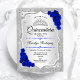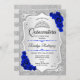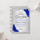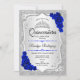 Fiesta Quinceanera - Invitación plateada. Incluye rayas, letra de guión, rosas azules reales, tiara y confetti. Diseño elegante con un Relieve metalizado de plata falso purpurina. Perfecto para una elegante celebración de glam.