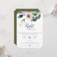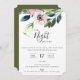 Invitación de celebración la Noche Anterior. La tarjeta presenta un elegante ramo floral de jardín en tonos elegantes de blanco, púrpura y verde. Diseño de tipografía moderno y chic.