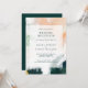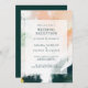 Esta invitación de recepción de boda abstracta colorida es perfecta para su recepción moderna y boho única. Pintada a mano con marcas de pincel texturizadas de verde esmeralda oscuro, melocotón y mostaza, todas superpuestas con un cuadrado transparente minimalista, seguro que dará a su ocasión un toque simple pero rústico bohemio.