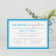 Invitaciones solo para recepción con un diseño de tipografía azul y gris moderno y un borde azul y gris para la celebración posterior a la boda. La parte posterior es un azul sólido.