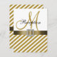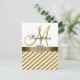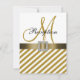 Invitación de recepción de boda con monograma dorado y blanco con un patrón de rayas diagonales y una cinta de satén dorada IMPRIMIR y un broche de diamantes cuadrado IMPRIMIR en un diseño de tarjeta plana cuadrada. Diseño de Elke Clarke ©2012. Gráficos licenciados. Personalice con el texto de su monograma, nombres y invitación de recepción de boda utilizando las indicaciones o seleccione "personalizar" para más opciones de edición. A las novias les encantan las invitaciones adornadas con joyas y cintas hasta que llegan a la oficina de correos y se dan cuenta de que las invitaciones costarán mucho más para enviar a sus invitados. Estas invitaciones y accesorios de paquete de boda tienen la foto de la cinta de satén y el broche de diamantes IMPRIMIR en la tarjeta plana. Obtiene el efecto elegante sin el costo extra y el trabajo de ensamblar sus invitaciones. Por favor, póngase en contacto con luxuryweddinginv