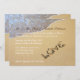 Invitación de recepción de boda con tema de playa elegante perfecta para la pareja que se fuga o se casa en un destino de boda. El fondo de la invitación está hecho usando una fotografía de una playa arenosa, con la palabra amor escrita en la arena. Personalice el texto para adaptarlo a sus necesidades.