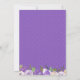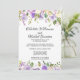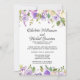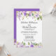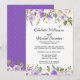 Flores de color púrpura oscuro, rosas de color púrpura claro y flores de color blanco marfil están anidadas en una variedad de hojas y ramas. Crean un bonito borde floral a lo largo de la parte superior e inferior de esta invitación de recepción de boda íntima. La parte posterior de la invitación es de color púrpura real con puntos blancos muy pequeños. El borde floral continúa a lo largo de la parte inferior.