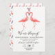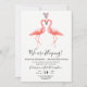 ¡Nos escapamos! Anuncio de fuga con invitación a la recepción con una pareja de flamencos rosas. Encuentra papelería a juego en nuestra tienda.