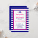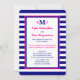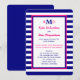 Esta invitación de recepción de boda después de la boda presenta un tema náutico en rosa intenso, azul marino y blanco. Los detalles de la invitación están impresos en rosa intenso y azul marino sobre un fondo blanco con borde azul marino y rosa con un fondo de franja azul marino y blanco. Sus monogramas están colocados de manera prominente en la parte superior con el monograma de su apellido y monogramas de iniciales individuales. Esta es una excelente invitación de recepción de boda después de la boda con tema náutico de franjas. Copyright henishouseofpaper
