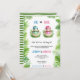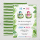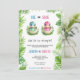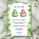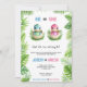 Invitación de revelación de género con dos huevos de dinosaurio de dibujos animados, uno azul y otro rosa, rodeados de hojas verdes. El texto dice "Él o Ella" y detalla un evento para Joseph y Arieta.