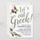 Celebra tu futuro matrimonio con un evento de degustación de comida al estilo griego. Permita a todos socializar mientras degusta lo mejor de la cocina griega. Esta invitación se compone de ramas de olivo que enmarcan el costado con las palabras "Comamos griego" hacia el centro. En el lado de la marcha atrás se ven las rayas blancas y las salsas. Todos los elementos de la invitación son desbloqueados y personalizable Incluyendo la frase "comamos griego".