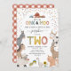Invitaciones de segundo cumpleaños a un patio de labranza con un simple fondo blanco, adorables animales de granja que incluyen una vaca, cabra, cerdo, oveja, burro, caballo, conejo, pato y gallo, y una plantilla de celebración de cumpleaños para niños que es fácil de personalizar.