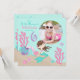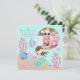 Pequeña carta de invitación de sirena de seis años con criaturas submarinas y una plantilla de inserción de fotos.