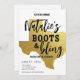 Haz que los sueños de Soltera en Texas de ella se hagan realidad con esta fabulosa Invitación de Soltera en Texas: Botas y Brillo. Pon el enfoque en la dama afortunada con su diseño glamuroso en negro y dorado y mapa dorado de Texas, lista para que ella levante sus botas y se divierta.