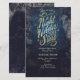 Invitación de Tarjeta de Una Noche Bajo las Estrellas con tipografía elegante a mano de “Una Noche Bajo las Estrellas”. Este diseño incluye elementos de azul oscuro, dorado y un fondo estrellado nocturno. Incluye una plantilla para personalización personal.