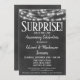 Una divertida invitación de pizarra de tiza negra y blanca para fiesta de aniversario sorpresa con luces brillantes en la parte superior.