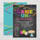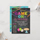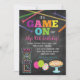 Nuestra original y más vendida invitación de cumpleaños estilo pizarra para la fiesta de arcade de pizza Game On para niñas es la invitación perfecta para cualquier fiesta temática de juegos con un tema de arcade, laser tag o pizza. Nuestro diseño presenta un fondo de pizarra, una mezcla de letras coloridas y gráficos de juegos de arcade, pizza, globos y láser.