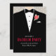 Invitación de fiesta de soltero con gráfico elegante del novio con traje y una sola rosa roja. Edite estas invitaciones con sus propias palabras, el nombre del novio y los detalles del evento previo a la boda. © Diseño único y arte gráfico de Sarah Trett. www.sarahtrett.com para www.mylittleedenweddings.com